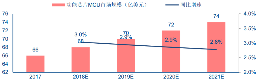 汽车半导体按种类可分为功能芯片 MCU(Microcontroller Unit)、功率半导体(IGBT、MOSFET 等)、传感器及其他。根据Strategy Analytics,在传统燃油汽车中,MCU 价值量占比最高,为23%;在纯电动车中,MCU 占比仅次于功率半导体,为11%。DIGITIMES预测,功能芯片MCU市场规模有望从2017年66亿美元稳步提升至2020年72亿美元。