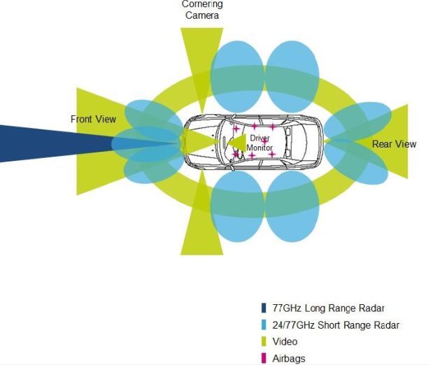 雷达芯片:1)77GHz远程雷达系统,采用 SiGe(硅锗)技术保证高频功能和耐用性,可用于避撞系统;2)24GHz近/中程雷达系统,同样采用SiGe(硅锗)技术,可用于盲点监测系统。