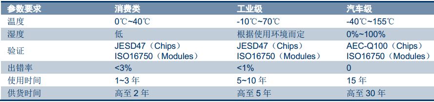 相比于消费芯片及一般工业芯片,汽车芯片的工作环境更为恶劣:温度范围可宽至-40~155℃、高振动、多粉尘、电磁干扰等。由于涉及人身安全问题,汽车芯片对于可靠性及安全性的要求也更高,一般设计寿命为15年或20万公里。“车规级”芯片需要经过严苛 的认证流程,包括可靠性标准 AEC-Q100、质量管理标准ISO/TS 16949、功能安全标准ISO26262等。
