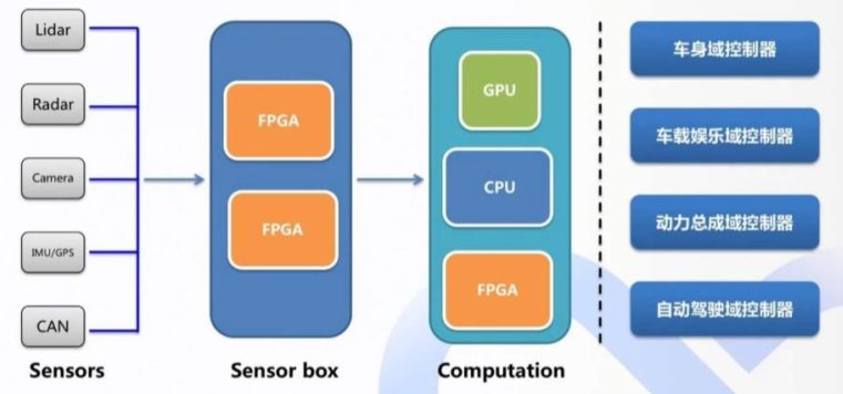 百度 Apollo:恩智浦/英飞凌/瑞萨MCU+赛灵思 FPGA/英伟达GPU。百度无人驾驶样车采用 IPC(工控机)方案,但工控机的体积和功耗难以满足量产化要求,因而百度也推出了适合于量产的域控制器嵌入式方案。将各个传感器的原始数据接入到Sensor Box中,在Sensor Box中完成数据的融合,再将融合后的数据传输到计算平台上进行自动驾驶算法处理。