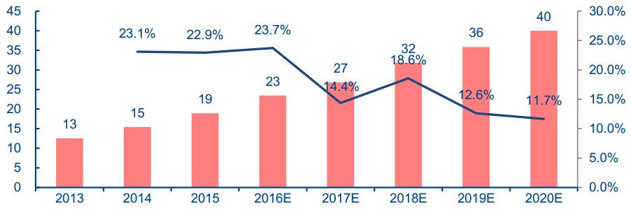 ▲ 汽车功能芯片市场规模(亿美元)