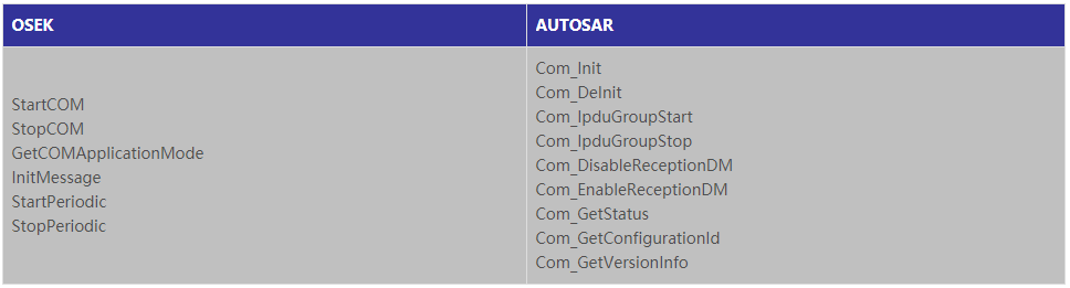 根据通信部分提供的功能,对比两者在相同功能上的API,以及两者各自所特有的API,由于AUTOSAR COM较之OSEK COM,多出了一个COM Manager,即通信管理模块部分,所以整个AUTOSAR COM Manager为AUTOSAR标准所特有,下面先对两者的相同功能部分作比较。