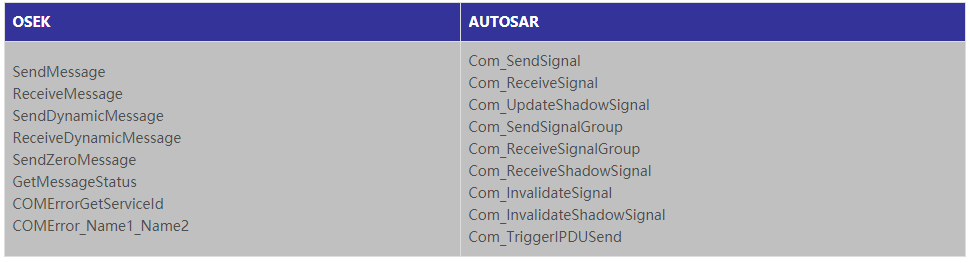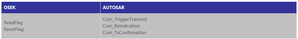 通过对比可以看出,OSEK通信服务中包含了对错误的一些简单的处理,如获得错误服务的Id(COMErrorGetServiceId),而AUTOSAR通信服务仍然包含对I-PDU的处理,如Com_TriggerIPDUSend。