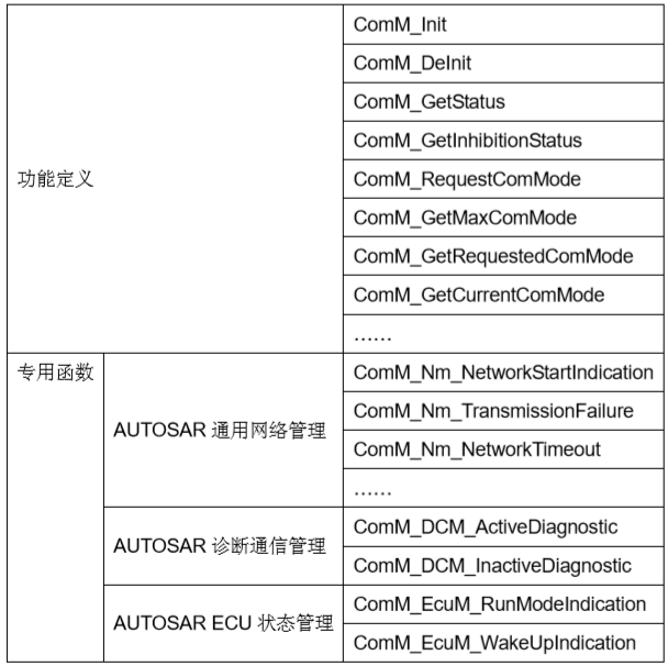 (4)AUTOSAR的通信部分有一个COM Manager,这是一个通信管理模块,是AUTOSAR标准特有的,主要负责对通信进行监控、管理、诊断以及管理涉及通信的ECU状态。下表列出了它所提供的部分API。