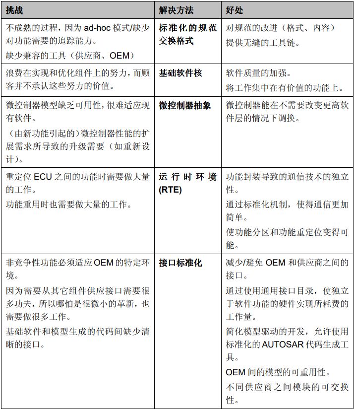 为了实现上述的项目目标,针对在汽车电子行业中面临的一些挑战,AUTOSAR 所采用的解决方案及其好处可以概述如下: