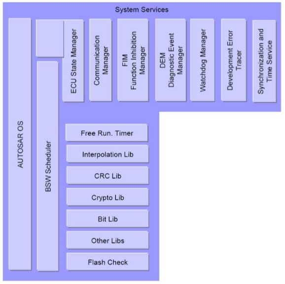 系统服务是一组可以由所有层次模块使用的模块和功能。例如实时操作系统、错误管理 器和库功能。为应用和基本软件模块提供基本服务。它包下图所示功能: