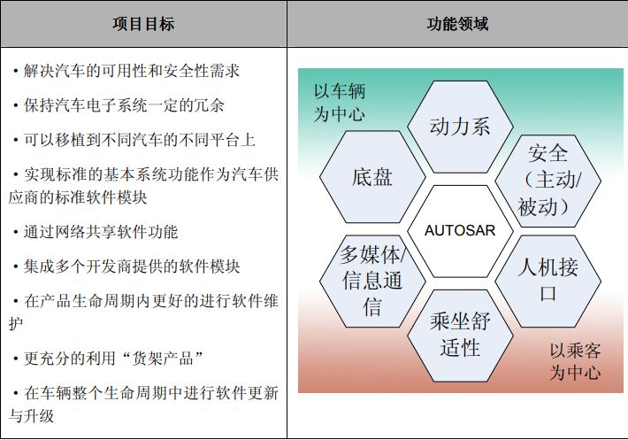 AUTOSAR 的提出正是基于以上一些软件发展的要求,由几大主要汽车厂商以及部件提供商联合提出的,其中包括 BWM, DaimlerChrysler, Ford Motor, PSA Peugeot, Toyota Motor, Volkswagen AG, Bosch, Continetal, Siemens VDO 等。AUTOSAR 是针对特定的汽车电子这一领域,提出的一套开放式软件结构。其主体思想是使得软件设计开发更易于管理,软件系统更易于移植、裁剪,以及更好的维护性和质量保证。AUTOSAR 组织所提出的目标以及它所关注的功能领域在下表中列出: