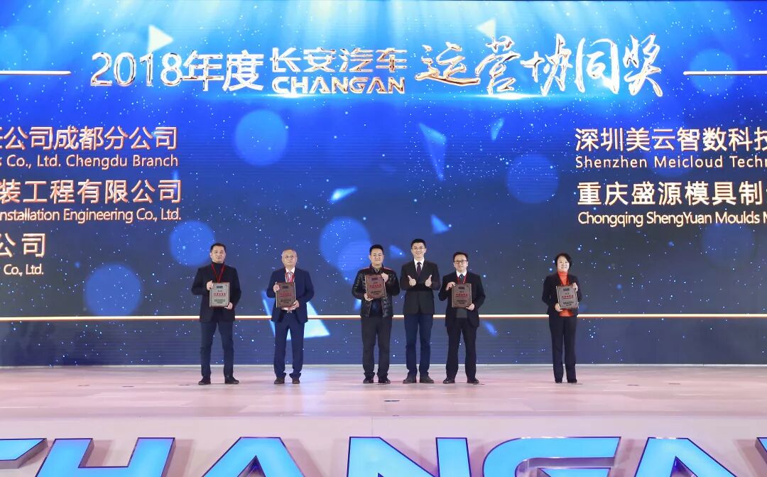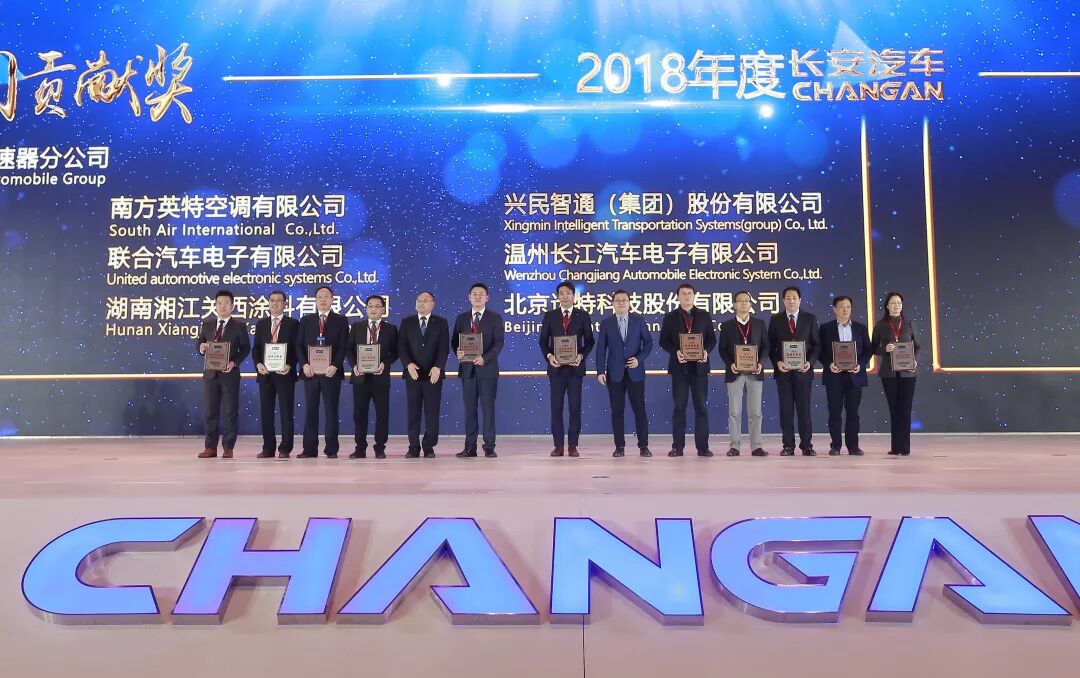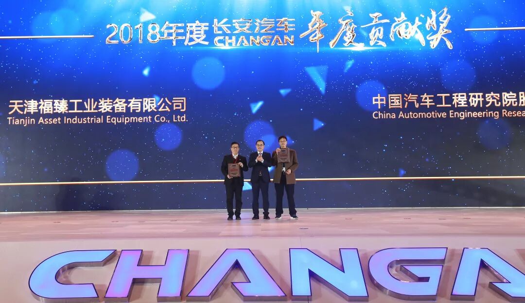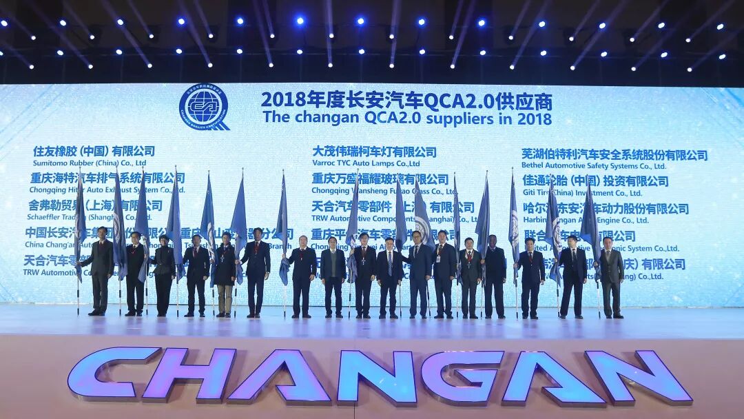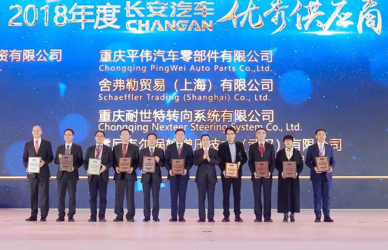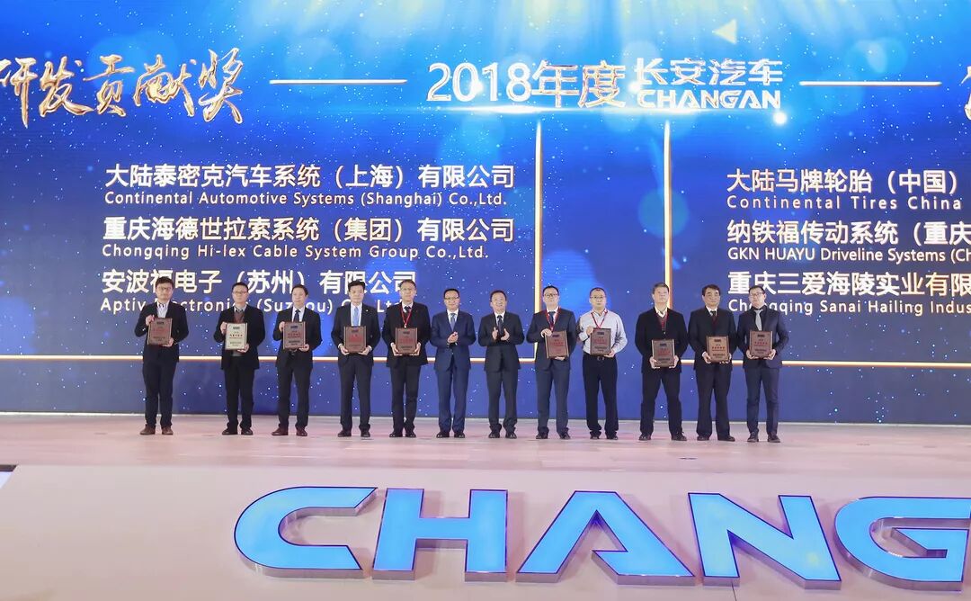 长安汽车总裁朱华荣为2018年“年度贡献奖”获奖供应商颁奖。